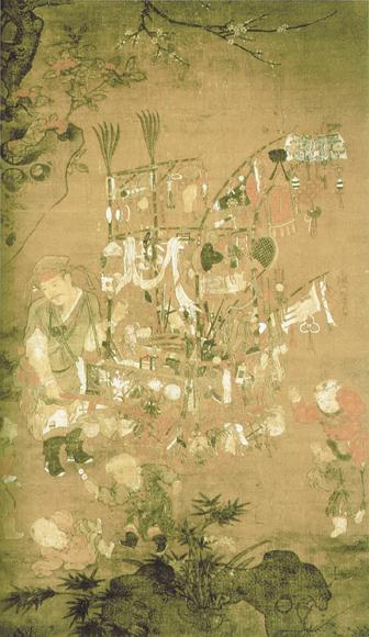 现藏于北京故宫博物院的李嵩《货郎图》卷,画面上货郎肩挑杂货担,旁边是欢呼雀跃的儿童。货担上物品繁多,从锅碗盘碟、儿童玩具到瓜果糕点,无所不有。在商品流通尚不够发达的南宋时期,一副货担就是一个小小的百货店,货郎们不仅为偏僻的乡村带来所需的货物,也带来各种新奇的见闻,货郎的到来往往像节日般热闹,李嵩在图中就描绘了这样一幅场景。那些令人眼花缭乱的物品,虽然今天有很多已不明其用途,但却真实地记录了南宋百姓的生活方式,是民俗学家不可多得的珍贵史料。