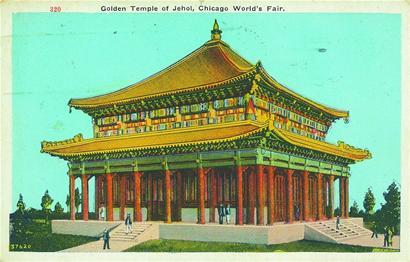 捷荷尔金庙系仿照地处河北承德的清朝皇帝避暑山庄中的一座喇嘛庙兴建。红色的柱子,黄色的琉璃瓦,庄严而又气派。整座建筑先在中国构建,完成后再分拆成2.8万个部件并逐一进行编号造册,船运至芝加哥,最终按编号精确完整地装配而成。约有6万名观众前来参观。
