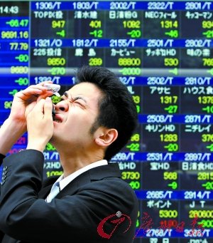 许多贫穷的日本人死撑面子,衣着光鲜但是内心愁苦。图为一名日本年轻人在股票行情牌前滴眼药水。