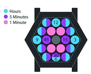 日本手表制造商Tolyo Flash的设计标榜新潮奇特,不少产品美则美矣,但让人搞不懂怎么看时间。这款“六边形手表”目前还只是概念表,它的卖点在于用比时针、分针、秒针更简易的方法表达时间。蜂窝形的表盘上布满圆点LED彩灯,蓝灯代表“小时”、紫灯代表“5分钟”、粉灯代表“1分钟”,3点、6点、9点、12点等四个刻度与普通表位置一致。虽然设计者简化时间显示的出发点是好的,但这种新奇的方法似乎不比分针秒针更容易明白。左图显示的时间为12点47分。