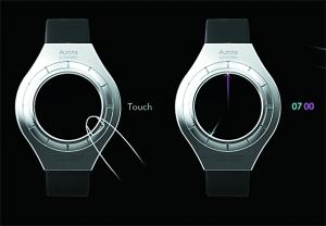 “欧若拉”是古罗马神话里的曙光女神,掌管北极光,代表旭日东升前的黎明,是令人充满希望与期盼的女神。这款表的独特之处在于完全透明的表盘,当手指触碰表盘的时候就会射出两道镭射光束,红色光束代表“分钟”、蓝色光束代表“小时”。“欧若拉”处于“隐形”的时候是彰显个性的配饰,“点击”后就变身时尚手表。可惜它目前仍处于概念阶段,因为还需要安装一个自动防故障装置,防止镭射激光烧焦手腕上的毛发。