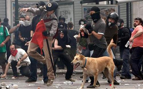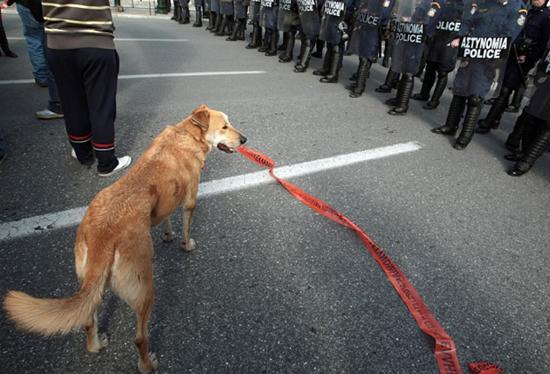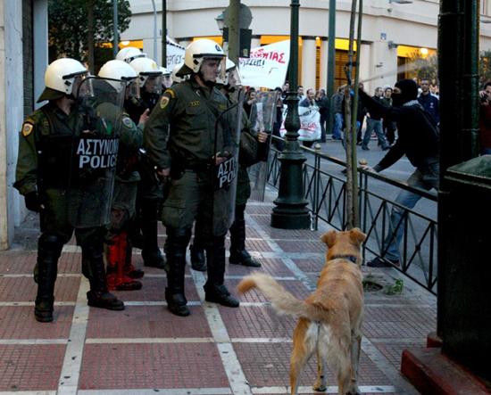 2008年的希腊雅典骚乱中,一只土黄色的流浪狗因为不惧怕辣椒水、催泪弹,参加了多次抗议活动,它的身影出现在多张暴力活动的照片中。如今这条狗成了希腊的明星狗,人称“暴动犬”或“抗议犬”,网友还在facebook上为它建了个人网页。(宇桓)