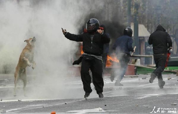 2010年4月,在左翼示威者、公务员、教师联合举行的抗议活动中,这只狗与防暴警对峙。