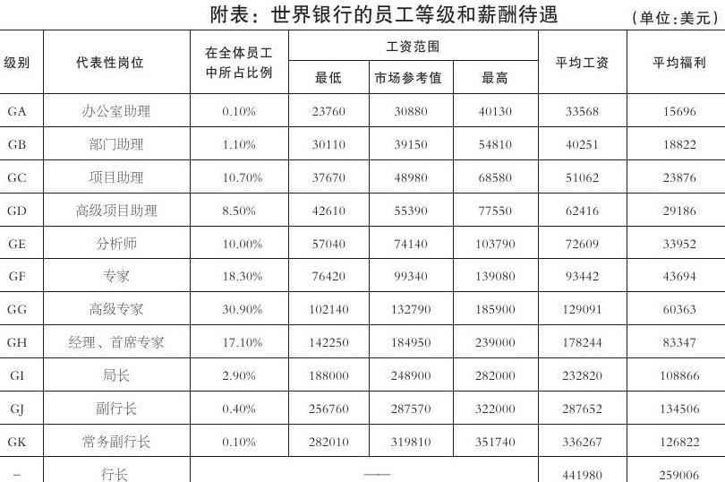 世界银行薪酬福利级别差别较大,体现了对员工能力差别的尊重,可以起到激励员工进步的作用,较高比例的非工资福利则有利于稳定员工队伍。客观地讲,同美国当地的普遍收入水平相比,附表所列世界银行总部员工的直接工资收入并不算高,但是世界银行的工作比较稳定、受人尊敬,日常工作压力较小,很少有裁员风险,非美国公民不需要按照美国法律交纳个人所得税,享有可观的非工资福利等因素,世界银行员工的薪酬待遇还是相当优厚的,这也是世界银行之所以能够吸引到大量优秀人才的一个重要原因。
