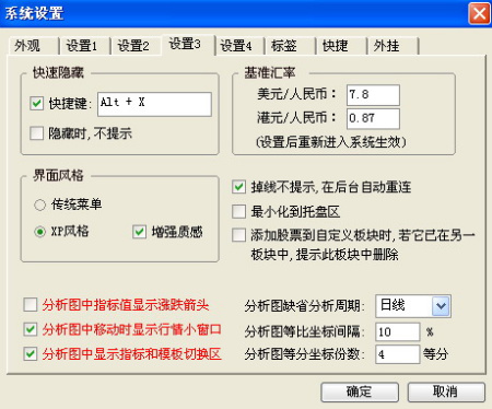 1、点击“工具”菜单中的“系统设置”板块,再点击“设置3”,再点击勾取“快速隐藏”下方的“快捷键”,可以自主设置快捷键及隐藏是否提示等功能。
