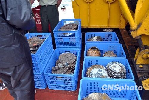 2010年5月10日,位于汕头南澳县乌屿和半潮礁之间海域的明代古沉船“南澳Ⅰ号”再有上千件文物出水。据了解,“南澳Ⅰ号”古沉船里面的文物摆放整齐,没有太多损坏。而且大部分也没有翻动过。 中新社发 牟财源 摄