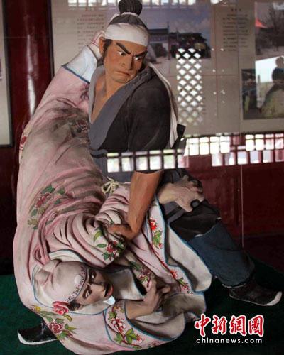 图为阳谷县城千年狮子楼上由天津“泥人张”20多年前制作的彩绘泥塑武松怒杀西门庆。 摄影:鞠成立