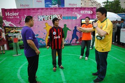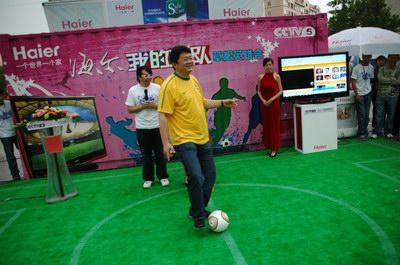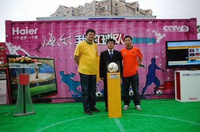 山东 2010-05-31(中国商业电讯)--5月30日,在世界杯全球如火激情即将燃起之际,由海尔主办的“海尔我的球队”全国十城市海选活动,在青岛市北区台东当代广场拉开序幕。央视体育频道著名主持人张斌、《体坛周报》副社长兼体坛传媒副总裁颜强、海尔集团社区店经营体总经理张立顺一同出席了启动仪式。