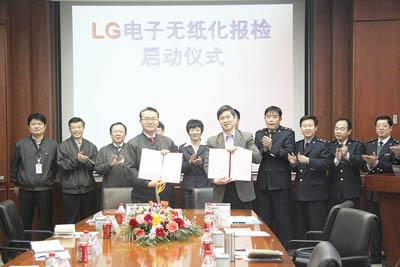 ⑤天津检验检疫局运用信息化手段帮助企业实现无纸化报检,解决效率低、成本高的问题。图为乐金电子(天津)电器有限公司无纸化报检业务启动现场。