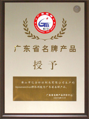 2009年12月,经过广东省名牌产品推荐委员会评审, “aqounsenton”最终从众多优秀的品牌中脱颖而出,被广东省名牌产品评价中心授予“广东省名牌产品”称号!“广东省名牌产品”的获得,是Aqounsenton荣获众多荣誉之后的又一殊荣,也是对Aqounsenton品牌独特品味、针范品质的又一次肯定,更加坚实了其国际品牌的地位!