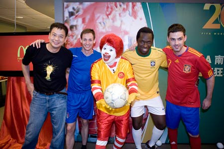 图为北京麦当劳食品有限公司总经理曹文宝先生(左一)与麦当劳叔叔及外国球迷朋友共同为世界杯喝彩