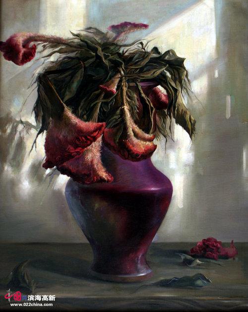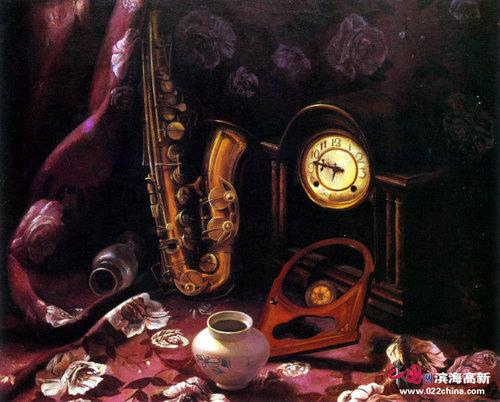 再如《岁月无声》,紫罗兰色调神秘而高雅,上面的白花跳跃出来,白灿灿的。残破的钟表和铜萨克斯是紫色和黄色的补色关系,加上弥漫于画面的光彩,让人激动不已。画家童年时对钟表的记忆,留下深刻的印象,画面里的萨克斯似乎透过遥远的时空,在隐隐约约演奏着孩童时的音乐,让人感受到遥远时光给人留下的深刻的记忆。还有《残秋》,古色古香的唐三彩,画室角落干枯的鸡冠花,干枯的石榴以及破木板,质朴而不做作。画已枯萎,但是骨架依然顽强,微妙的色彩变化使张文亮的静物创作,有了质上的飞跃。再如曾在天津日报上发表过的《秋菊》,墨绿色的背景,衬上橘黄色的橘子,白色的菊花,既简单又单纯完美,有一种安详的意境。画家尽力刻画各种物体的质感和光影效果,尤其前面的黄色衬布,刻画得很柔软,连上面的细微花纹都画得惟妙惟肖,很是逼真,整幅画给人一种轻松的感觉,这也是这幅作品最最成功的关键。