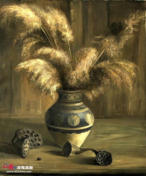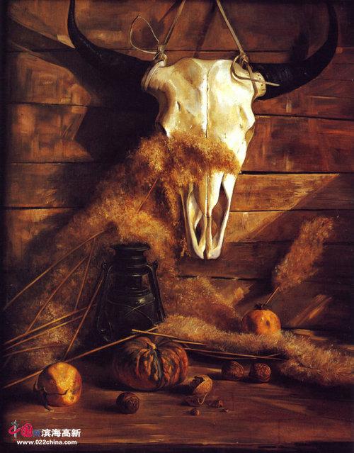 张文亮所著21世纪美术教学从书《油画静物》一版再版,映衬了画家沿着自己的创作历程,一步步艰难地走过来的印记。在书中,画家画的静物,那是对构图学、光影学及油画技术表现力全方位的一种思考和总结。如他创作的油画《原野的回忆》,这幅画是画家在深入草原生活后的一种新的体验,是一种感情的释放。画中的残破的木板墙,上面挂着牦牛头骨……画家的成功之处,不是去画茫茫大草原,也不是去画成群的牦牛和牧民,而是用静物去述说已经远逝的历史,这是画家独具的匠心,画面上没有宏大的场面,也没有具体的人物形象,只是这些已经过了时的静物。画家用独特的眼光,以细节放大历史,用细节来解释历史,牦牛头骨也好,马灯也好、干芦苇也好、核桃也好、南瓜也好,都是具体的细节,细的不能再细的细节,通过这些细节,跨越了昨天,连着今天和明天,放大了历史,那种超越时空的想象力,让静物来表述“意”,激活了历史,让人浮想联翩。最能打动人的是同类色的暖调子,温暖的阳光,让观者有种温馨的安全感。在画芦苇花的时候,张文亮尽量让自己体会手能在其中穿梭的空间感,还有阳光洒在上面的星点,南瓜褶皴的表皮,核桃坚硬的表面,这些物体的质感都可以从不俗的画面中感觉到。
