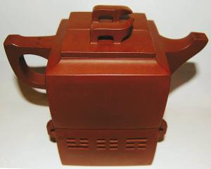 阴阳无极壶以深藏多年的原矿特级紫砂为原料,在设计中融入中国太极元素,以抽象方式表达金木水火土五行意念。壶呈正方形,轮廓清晰、线条流畅、古朴雅致、挺括秀气。整个壶分为上下二部分,上半部是壶身,下半部形似八卦炉,可以拆卸,可以合一,构思巧妙。而壶身又分割为阴阳两份,分别可以同时泡两种茶,壶嘴上有两个出水口,壶柄手捏处有对应的两个小洞,利用气压原理,用大拇指按住不同的小洞,则可以缓缓倒出壶身中不同茶水。壶下半部分的八卦炉可以点蜡烛、燃炭火,以保持茶温。整个壶制作工艺严谨、比例协调,转换吻合贴切紧密,实为壶中精品。这把壶在去年举行的第十一届中国工艺美术大师精品展中荣获特别金奖。