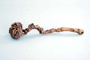 竹根雕梅花如意(长38.2厘米,如意首宽8.7厘米,下图),呈棕色,包浆自然。作者借用竹根弯曲自然的形状,以圆雕、镂刻、高浮雕等多种技法刻成。一枝曲茎为如意柄,柄把上疤结深邃逼真,淑朵花枝盘茎而攀附,如意首花枝盘绕,花朵绽放,如同绣球,且造型优美,雕工卓尔不凡,线条弯曲巧致,浑然天成。