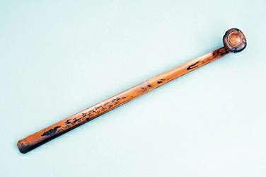 竹刻云芝首如意(长46厘米,如意首宽4.7厘米,上图),呈琥珀色,葆光莹润。如意用两节竹片制成,其身纤薄轻盈,如意手为竹节横弯反转而成,首面平凸,并阴线浅浮雕如意纹,柄中阴刻行书及款识。整件如意造型古拙,做工简洁奇巧,雅中透出精妙,十分耐赏。