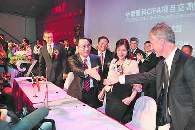 中联重科出快手并购意大利CIFA,一跃成为全球混凝土机械“老大”。 图为中联董事长詹纯新在签约仪式上与意方代表握手庆成交。 资料图片