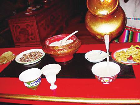 盛茶的礼节喝茶是蒙古族饮食的主要内容之一,在经历过多代人游牧生活的过程中便形成了独特而文明的盛茶习俗。蒙古族无论哪一次哪一顿茶都按先长者或家人次序盛茶,即父亲、母亲、儿子、儿媳、小孩儿的顺序盛茶。有时遇到满桌都是妇女,其中有一位小男孩儿时,人们很自然的对着小孩儿说一声:“啊!这里有一位男子汉。”尔后先给小孩儿盛茶以示重视。