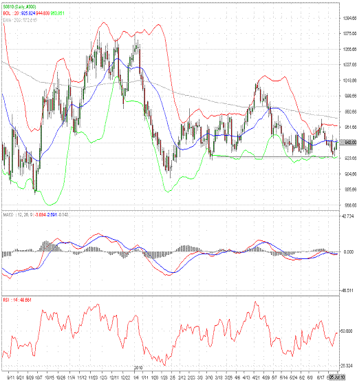 CBOT-8月大豆期货价格在925.00一带受到支撑并反弹,2日收光脚中实体阳线。技术指标方面,MACD(12,26,9)在零轴附近纠结,RSI(14)位于中轴附近,技术指标表现较为中性,建议投资者暂且保持观望,等价格跌破925.00后再进场做空。