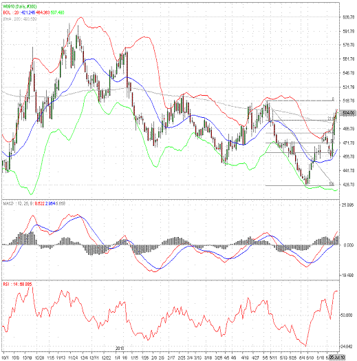 CBOT-9月小麦期货2日收阳线,价格反弹至最近一波下跌的76.4%回吐位上方。目前技术指标向多方倾斜,如果价格突破前期高点516.75,则意味着下跌趋势的反转,投资者可考虑构建多头仓位,在此之前,建议投资者保持观望。