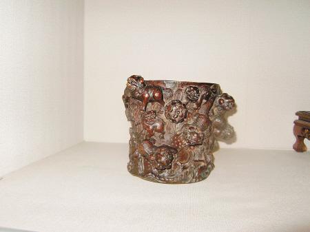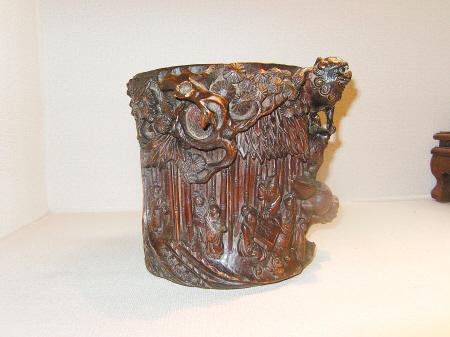专家点评:这件笔筒,通高19厘米,直径24厘米,为竹根雕材质,难能可贵的是此笔筒正面雕刻有著名的竹林七贤历史故事,背面雕有吉祥如意的太狮少狮图案,两个典故巧妙地融在一件笔筒上,实为罕见。