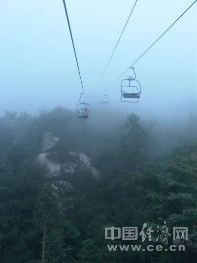 登山时恰逢大雾,坐着缆车缓缓上升,有如飞往仙境。