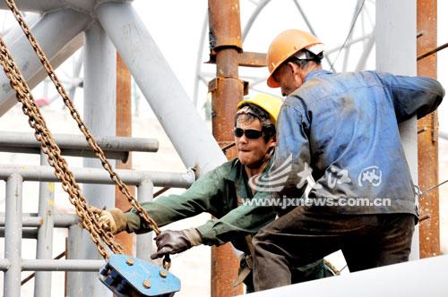 南昌国际体育中心建设工地工人冒高温工作 首席记者袁征/摄
