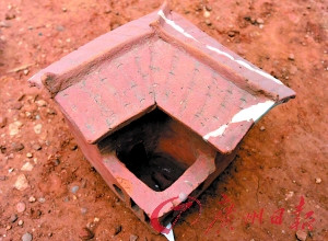 在众多陶制模型中,一套陶井显得很别致。它由井口和陶盖两部分构成。井口呈圆形,中部略款,刻着圆形条文,底部有圆形基座。陶盖呈四方形,中间的高点分出四条向下的梁,将四方形的四个角撑起,就像古典的凉亭。考古人员说,陶井以前的造型就是井口上面有凉亭,但由于年代久远,支撑陶盖的木棍腐烂了。记者发现,井口基座上确实有四个小孔,据说是当年插木棍用的。