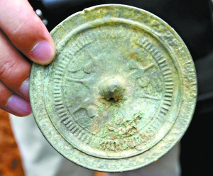 此次出土的铜镜只有小孩子的巴掌大小,拿在手里显得轻盈舒适,应该是古代妇女随身携带、随时整理妆容使用。铜镜保存较为完好,正面光洁依稀可见人影,北面的花纹也很明显。