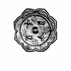 这样的八瓣菱花镜,又饰有花鸟,属于唐镜中比较花俏的,一般多为闺中小儿女所用,可随身携带以供照容。唐镜中以花鸟、走兽等为主题纹饰的镜子颇多,其中又以海兽葡萄镜最盛,花鸟镜与之相比少了些。此枚镜包浆自然,黑漆锃亮,图案明快,品相颇佳,不过在唐镜中也只算是普通,之所以要提到它,只因它是我从事铜镜收藏始收到的第一枚镜子,每次一看到它总会不由自主地想到引导我进入铜镜收藏领域的启蒙老师——吕岗先生。