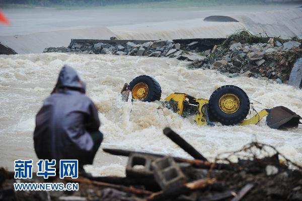 2010年7月12日,一位当地群众在青草镇拦河坝岸堤决口处观察水情。摄影:新华社记者 李健