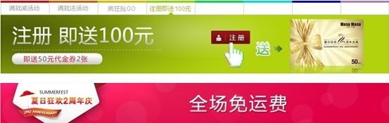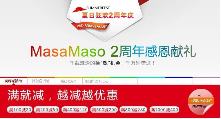 据介绍,MasaMaso(玛萨玛索)夏日狂欢两周年庆推出的让利活动具体为:“注册即送100元!”,只要在活动期间在MasaMaso(玛 萨玛索)官方网站注册成功,即可获赠100元代金券;“满50送50,多买多送”:凡购任意正价商品满50元送50元代金券1张,满100元送50元代金 券2张,以此类推;“满就减,越减越优惠”:如购物金额达1100元可减400+20=420元,此项可以循环累计,不封顶;“全场免邮费”:活动期间, 商品配送均是免费。值得一提的是,MasaMaso(玛萨玛索)此次让利活动有多种形式可共享,如“满50送50”及“满就减”,具体可见其官方网站。