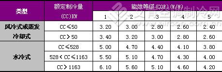 冷水机组又分为水冷式和风冷式或蒸发冷却式,前者的能效比较高。其能效根据国家标准GB19577-2004《冷水机组能效限定值及能源效率等级》划分为5个等级:
