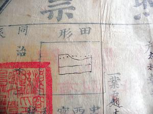 由于古代档案保存的条件有限,不像今天这样可以非常方便地到主管部门核实真实情况,因此防伪也是老地契非常注重的内容之一。不少老地契中,记者都看到上面盖的官印并不是只盖一次,在涉及到价钱、日期等地方都会盖上这方形的印。而且,上面只出现一半的印迹,另一半则不知去向。祁兵解释说这叫“骑墙印”,是古时一种防伪的办法,往往将买卖双方一式两份的契约叠加在一起,然后同时盖上一个印。辨认真假时,只要将印迹一对,如果能刚好吻合,那就是真的契约。