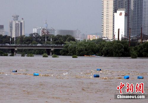 7月28日,吉林省永吉县境内发生特大洪水,永吉县经济开发区新亚强化工厂一批装有三甲基一氯硅烷的原料桶被冲入松花江中。事件发生后,吉林省迅速采取措施,在松花江沿途设置8道防线进行拦截。吉化公司已派出200多人组成的专业抢险队伍协助当地政府打捞。中新社发 张策 摄