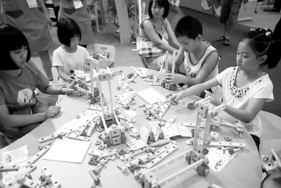 木玩世家虽然诞生不久,但已成为中国规模最大,发展最快的木制玩具精品店。该公司旗下共有3大系列近40个类别的玩具产品,全面照顾宝宝成长的每个阶段的不同需求,同时也顾及大人们的身心愉悦。图为孩子们正在认真组合玩具。