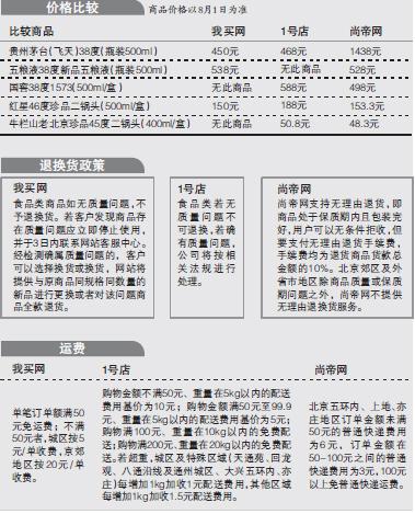 为方便消费者参考,记者从3家网站中挑选了价位不等的高中低档白酒商品加以比较。从商品价格比较表中可以看到,3家网站销售的白酒品牌与种类各有不同。我买网上,白酒品牌只有茅台、五粮液、红星、牛栏山、徽商与三和品牌,并且品牌下的商品种类也十分有限,例如茅台仅有38度飞天茅台在线销售,五粮液仅有38度、52度新品五粮液两种商品。在1号店,虽然白酒品牌较多,但是高档白酒品牌的商品种类并不丰富,例如五粮液仅有一款45度浓香型白酒(500ml/盒)在售。在尚帝网,白酒品牌较多,商品种类也较为丰富,五粮液有34款商品,还有其他两家网站所没有的水井坊品牌白酒。