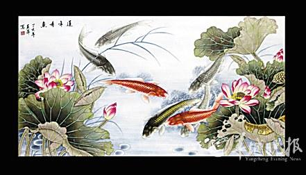 黄周生的瓷板粉彩《荷香十里》 黄萍的瓷板粉彩《莲年有鱼》