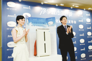 安利大中华区行政总裁颜志荣(右)与家居科技推广大使蒋勤勤为“逸新TM空气净化器”上市揭幕