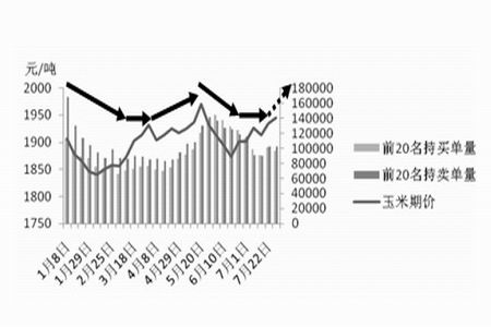 7 月份以来玉米主力多、空单持仓较前期(5 月20 日期价达高点时)均有所减少,前期多单平仓,空单平仓获利了结,在玉米期价4 月份进入相对高位之后,主力多、空双方分歧加大,对峙明显,资金方面给玉米市场的指引与推动相对有限,月末多头有获利平仓之举,目前主力空头略占优势,进而可能会在一定程度上压制盘面,但是主力多、空单持仓数量仍相差不大,进而使得资金面对玉米的压制非常有限,但近期在玉米期价略有回调之后,多头趁机追上,再加上基本面的偏多将使得玉米期价仍有希望继续震荡上行。
