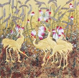 而旁边摇曳的风景,衬托出仙鹤与大自然融洽相处的美好氛围。几只仙鹤各有不同姿态,已经完全沉浸在如此美妙的意境当中,无暇顾及其他的事情……一幅充满着恬静、闲适、温馨、和谐的美好画卷,顷刻展现在观者的面前。
