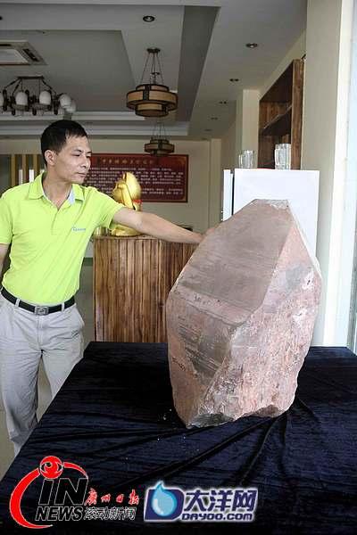 大洋网讯( 广州日报记者 曾焕阳 通讯员 蒋安春 摄影报道 )一块通体透彻、重约500公斤的天然水晶石,最近在河源市连平县陂头镇一溶洞内被当地村民发现并被挖掘出来。目前,这块天然水晶石已被河源市收藏家协会会长、藏石爱好者蒋鸿收藏。