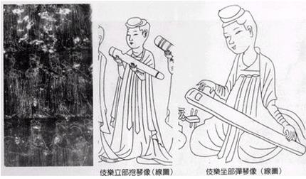 南京西善桥等地南朝齐、梁大墓砖印“竹林七贤与荣启期”壁画山的琴,具备全箱式特点而又呈现为新的样式,即音箱从东晋的内收弧形项的长条形,发展为方头、阔肩、收尾形态,这种样式的音箱能进一步改善琴的音响效果。