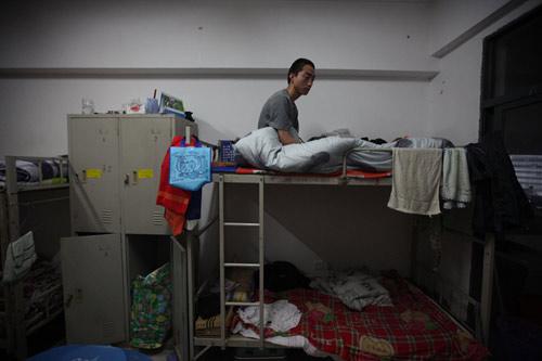 资料图:一名工人在宿舍内休息。在富士康,通常是8-10名员工共享一间宿舍。