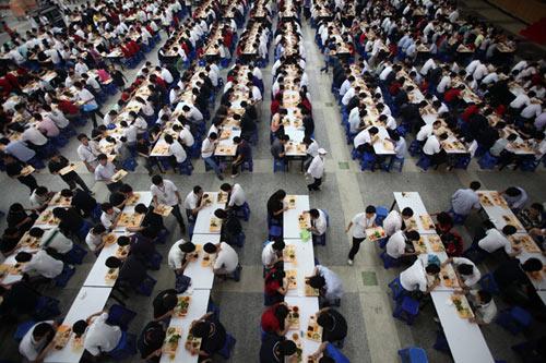 资料图:2010年5月10日。午餐时间,富士康员工在厂区食堂就餐。