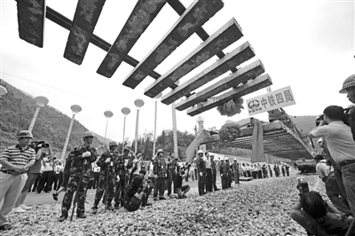 图为18日,铺轨机在宜万铁路恩施段铺设最后一段铁轨。 新华社发