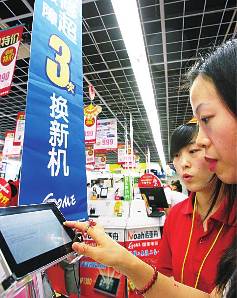 近日,为吸引顾客,国美电器再出重拳,大幅降价促销。图为顾客在北京一家国美电器商店内了解平板电脑方面的技术信息。