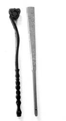 其二,9寸5分长9骨如意式竹胎漆骨。9骨是日本式,特点是大(边)骨、小(内)骨细窄无甚差别,只是大骨略厚实些。日式折扇股数少,折宽(档)自然大,便于书画表现,尤其讲究材质的名贵和制作的精细。此扇骨是民国早些时期漆器,做工考究,样式别致,髹漆精到,厚重牢固,色泽乌黑,泽光纯正,显示出漆骨固有的雍容高雅。大骨整体为如意形,寿字纹如意头硕大,易于粘牢纸面,小骨若水波(蛇形),相邻两骨峰谷交错,起伏连绵,给人以抑扬顿挫之感。聚头为花瓶式。贴面有“隆”字图案标志,尚不知为何地何家徽记?敬祈识者指教。