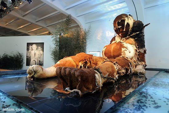 《巨人三号》是用一百多张完整的牛皮缝合包裹出巨大的半人半兽形象,类似的牛皮雕塑还有“英雄系列”,它们共同的特点是庞大和疲惫。 (尤伦斯艺术中心/图)