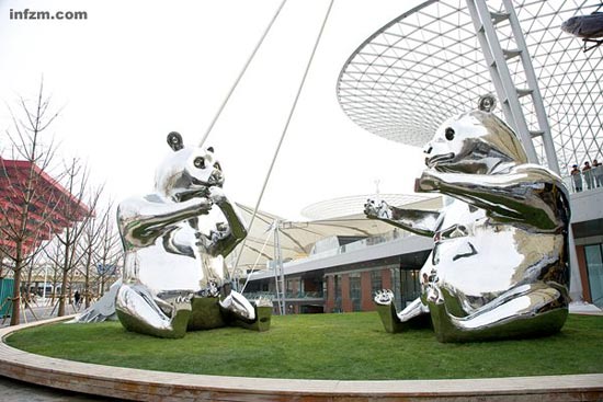 上海世博会上,张洹为世博轴创作的大熊猫雕塑“和和”与“谐谐”,这对熊猫雕塑耗资一百多万美元。它们并不像通常的熊猫憨态可掬,甚至有些凶悍,张洹说这表现了他所认为的中国人面对世界的态度:我要主张正义,我要参与这个世界。 (尤伦斯艺术中心/图)